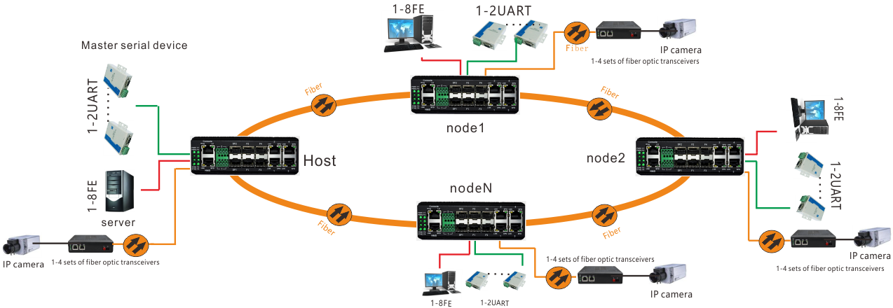 ◆ Support a variety of fiber network structure: point to point star chain ring network redundancy and can be combined for more complex network topology to support a variety of fiber network structure;