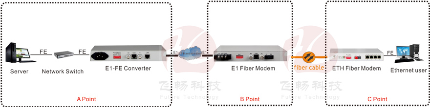 Ø Provide 2 impedances: 75 Ohm unbalance and 120 Ohm balance;Ø Can form the structure: Ethernet E1 Bridge(A)---Optical Ethernet Modem(B)---Ethernet Optical Fiber Transceiver (C)