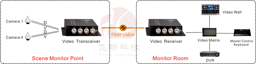 This digital video optical transceiver adopts digital video encoding and gigabit optical fiber transmission technology. The multi-channel single-direction bi-direction audio, video, data, telephone, Ethernet and switch real-time synchronization, no-distortion and high quality transmission is on the single-core or dual-core optical fiber. Complete digital video non-compression transmission technology, with video and data condition indicator, can monitor the system normal operation. It uses modular design, the user can flexibly select or customize configuration based on the scene occasion. Rack installation or desktop installation can be optional. This product is made up of optical transmitter and receiver. It can transmit 4Channel forward direction Video and 1Channel reverse direction RS485 data.