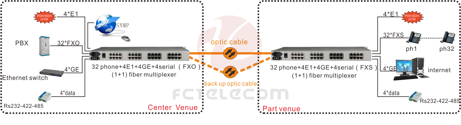 The Equipment provides 32*Voice, 1~4E1 interface, 4*10/100/1000M Gigabit Ethernet interface (Wire speed 1000M), and four extended service interfaces. 4*GE interface for the Switch port, can support VLAN division. 4 expansion service interface can be used as RS232/RS485/RS422 asynchronous data /TTL signal/Dry Contact signal and other transmission channels, the application is very flexible.