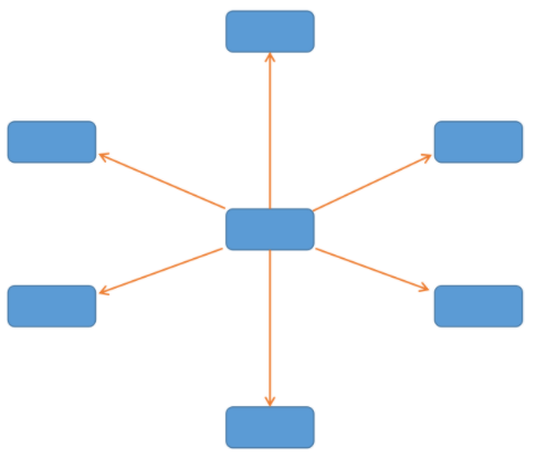 星型拓撲結構中,中央?yún)R聚節(jié)點單元以放射狀連接到網(wǎng)中的各個結點。網(wǎng)絡中的各節(jié)點通過點到點的方式連接到一個匯聚節(jié)點(多光匯聚型交換機)上,由該匯聚節(jié)點向每個目的節(jié)點傳送信息。星型拓撲結構圖如下: