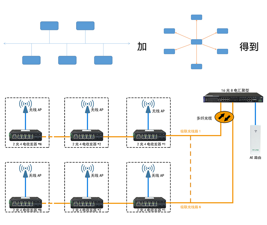 例如上圖:是多條總線結構(手拉手級聯(lián))連接到一臺匯聚交換機,組合成更大的復合型網(wǎng)絡。