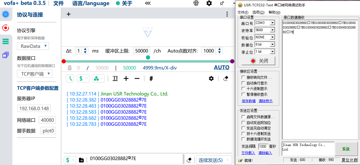 步驟 5 同步運行“串口調(diào)試助手”和“TCP/UDP SOCKET調(diào)試工具”軟件,測試串口服務(wù)器(即TCP服務(wù)端)和主機PC(即TCP客戶端)相互通信。