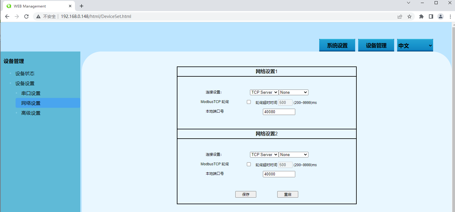 1. 登錄Web配置界面,選擇“設(shè)備管理> 設(shè)備設(shè)置 > 網(wǎng)絡(luò)設(shè)置”。