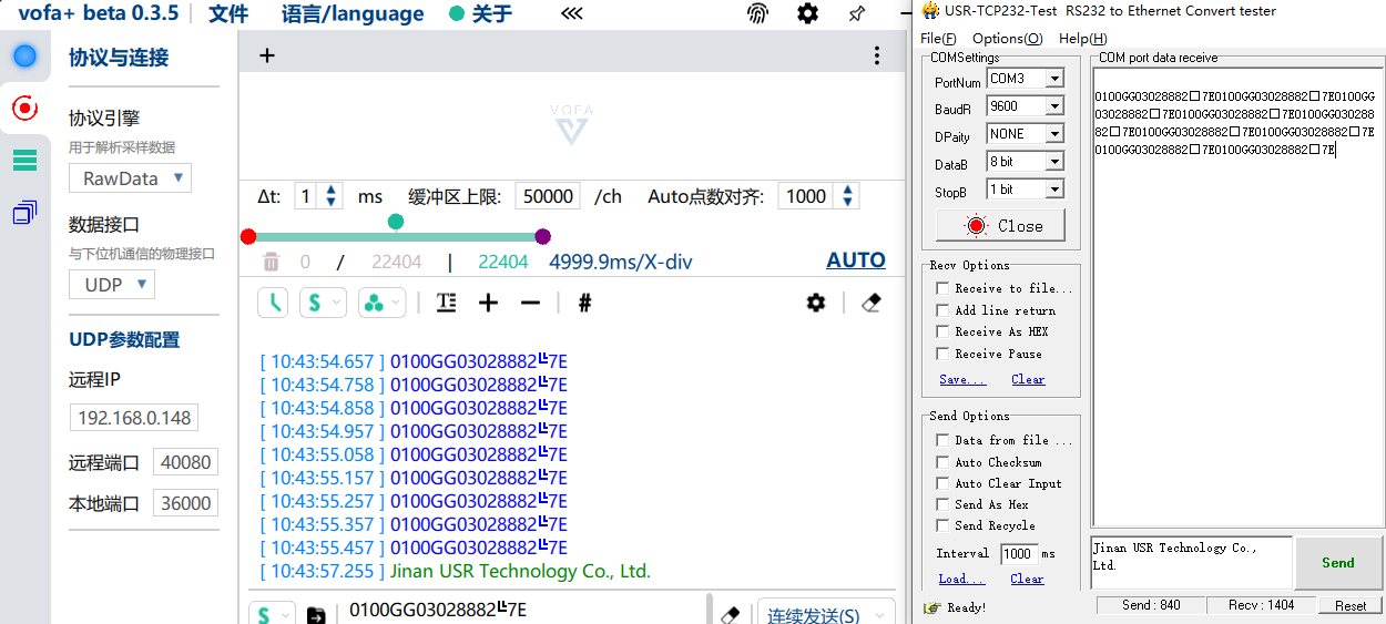 步驟五、同步運行“串口調(diào)試助手”和“調(diào)試助手”軟件,測試串口服務(wù)器(即Udp服務(wù)器)和主機PC(即UDP客戶端)相互通信。
