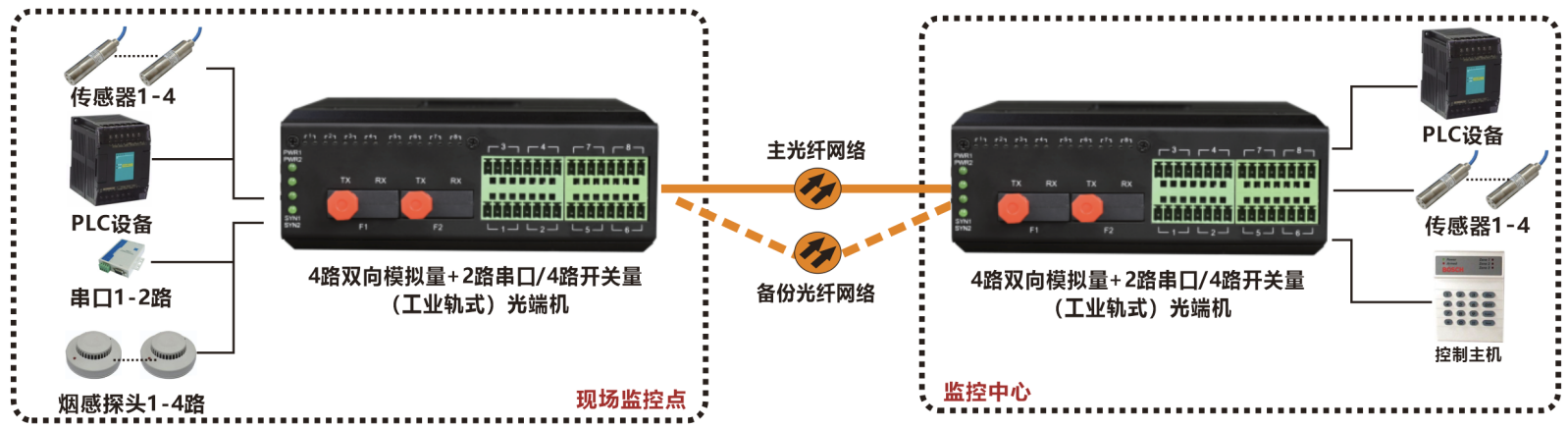 工業(yè)軌式 16路模擬量+開關(guān)量+串口 模數(shù)一體遠(yuǎn)程光端機(jī) (1+1光纖備份與斷纖保持功能)