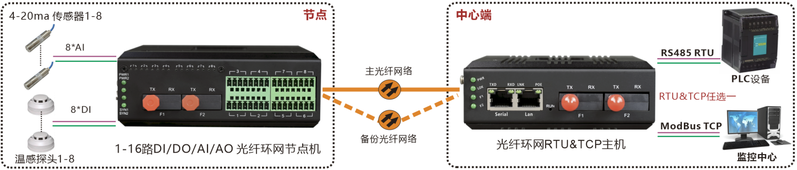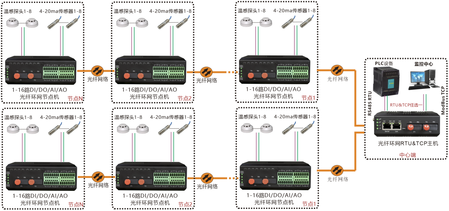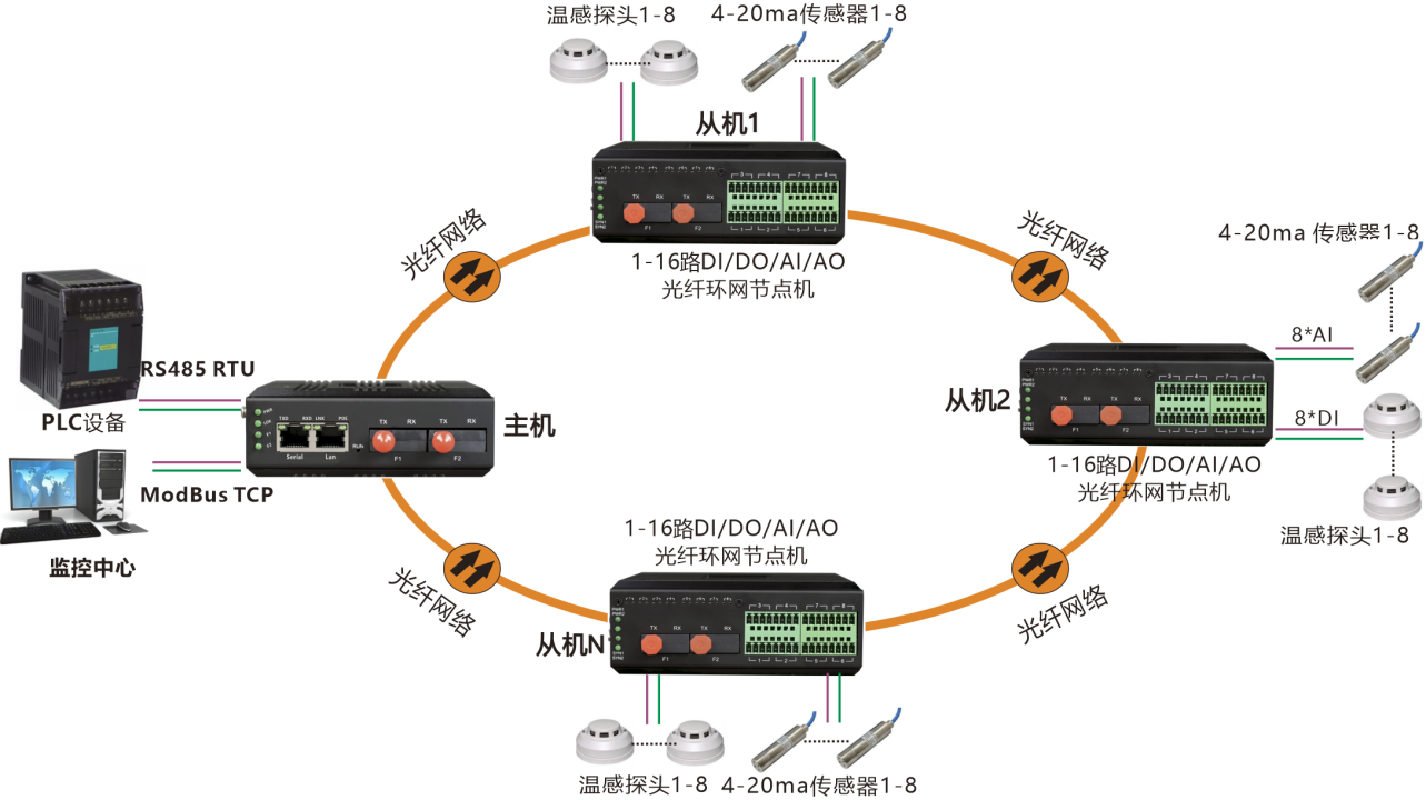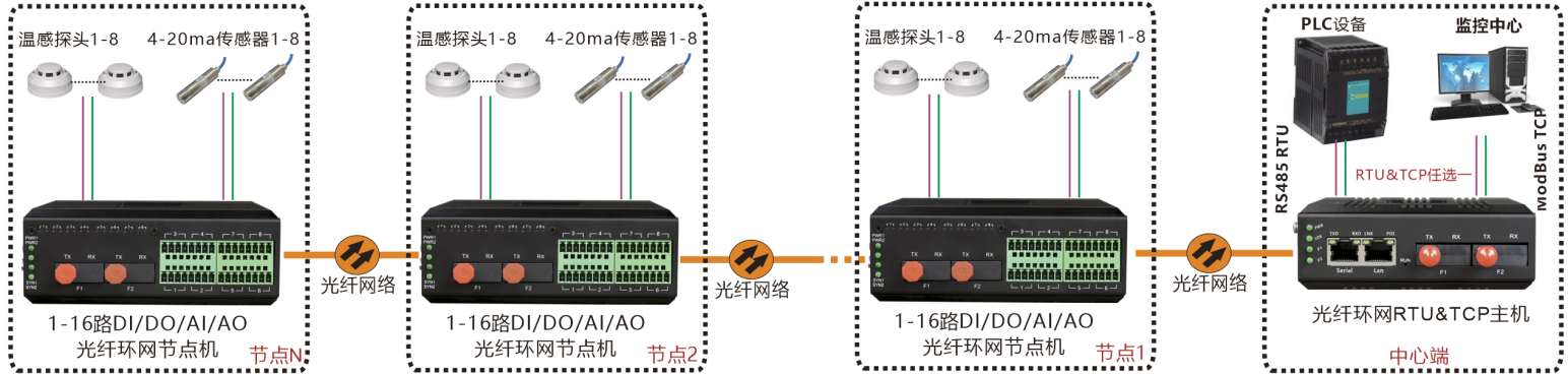 工業(yè)級(jí)環(huán)網(wǎng)型光端機(jī)提供每個(gè)節(jié)點(diǎn)最多16路DI/DO/AI/AO在光纖中傳輸,支持多種光纖網(wǎng)絡(luò)拓?fù)浣Y(jié)構(gòu):點(diǎn)對(duì)點(diǎn)通訊、鏈型網(wǎng)絡(luò)、星型網(wǎng)絡(luò)及冗余環(huán)網(wǎng)自愈保護(hù)等拓?fù)浣Y(jié)構(gòu),并可在此基礎(chǔ)上組網(wǎng)為更復(fù)雜的網(wǎng)絡(luò)拓?fù)浣Y(jié)構(gòu),具有環(huán)網(wǎng)自愈保護(hù)功能。主機(jī)采用ModBus RTU與ModBus TCP雙上聯(lián)接口,方便現(xiàn)場(chǎng)實(shí)施。