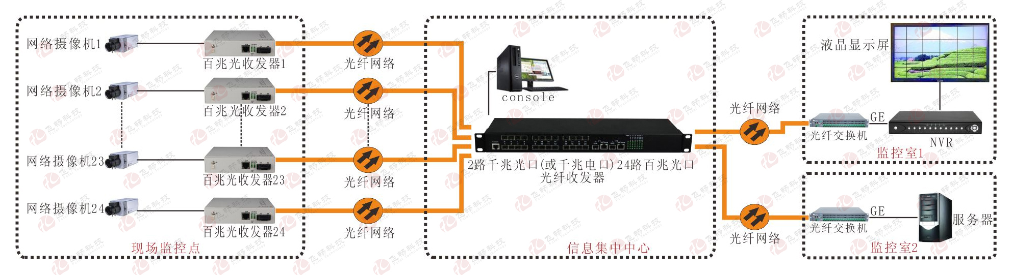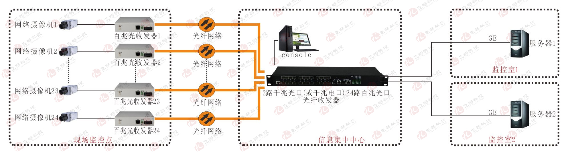 24+2光纖匯聚型交換機是一種用來將遠端的24個光方向百兆光信號集中交換的光電信號交換機。