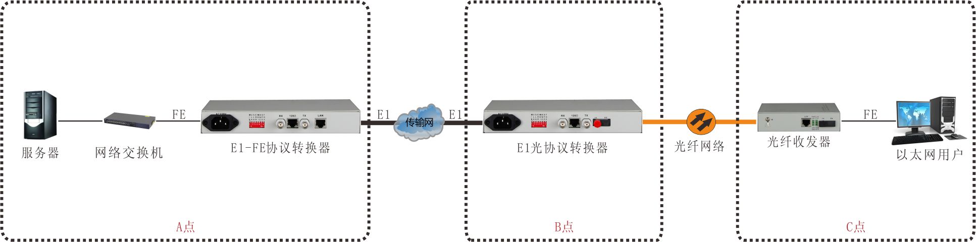 A點(diǎn)的一臺(tái)或多臺(tái)PC機(jī)的網(wǎng)卡連接到以太網(wǎng)交換機(jī)的以太網(wǎng)接口,通過以太網(wǎng)交換機(jī)的UPLink接口與FE1-10/100base-T協(xié)議轉(zhuǎn)換器的10/100base-T接口的連接,通過E1的傳輸與B點(diǎn)的E1傳以太網(wǎng)光口(100baseT-FX)轉(zhuǎn)換器轉(zhuǎn)成光纖后傳到C點(diǎn)的光纖收發(fā)器,與以太網(wǎng)交換機(jī)及用戶PC機(jī)等設(shè)備實(shí)現(xiàn)3點(diǎn)之間的以太網(wǎng)數(shù)據(jù)通信功能。 設(shè)備可設(shè)為成幀模式,E1傳輸線路帶寬為64k~2.048M;此方案可以從A點(diǎn)網(wǎng)管到B點(diǎn)與C點(diǎn)。
